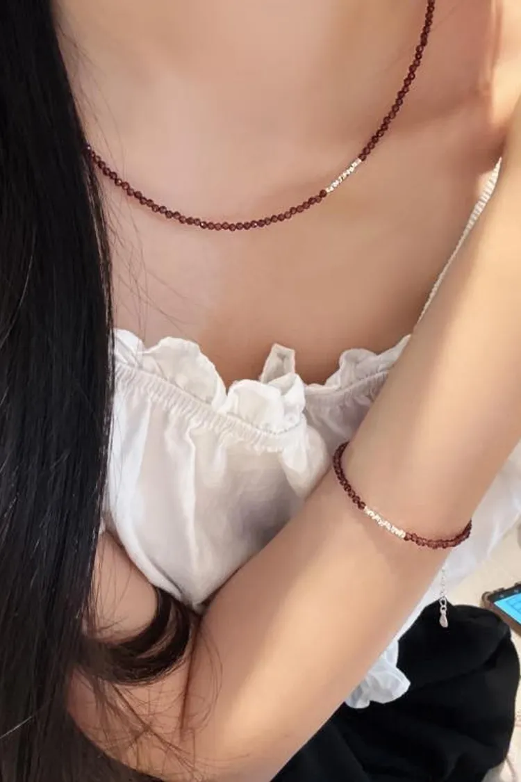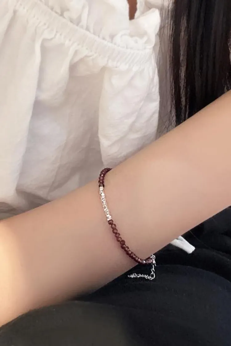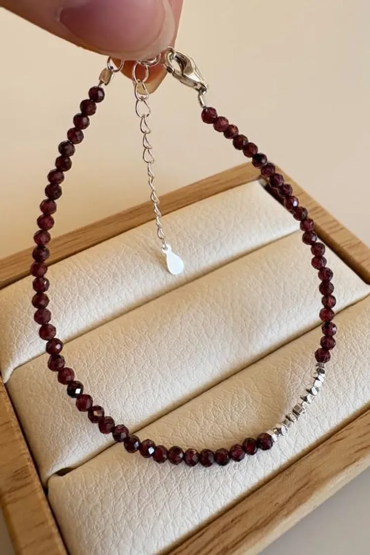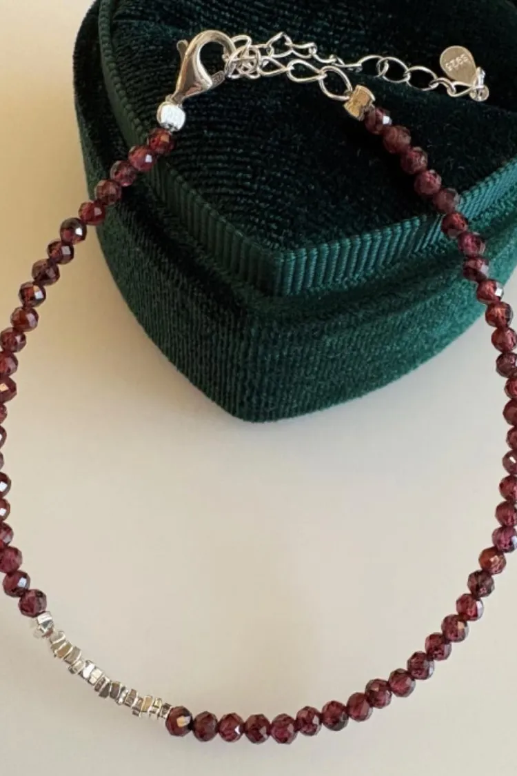 這款手鍊以細緻的切面石榴石,顏色深紅卻不厚重,戴起來很有氣質。中間搭配 925 純銀做小小提亮與點綴,低調又耐看。