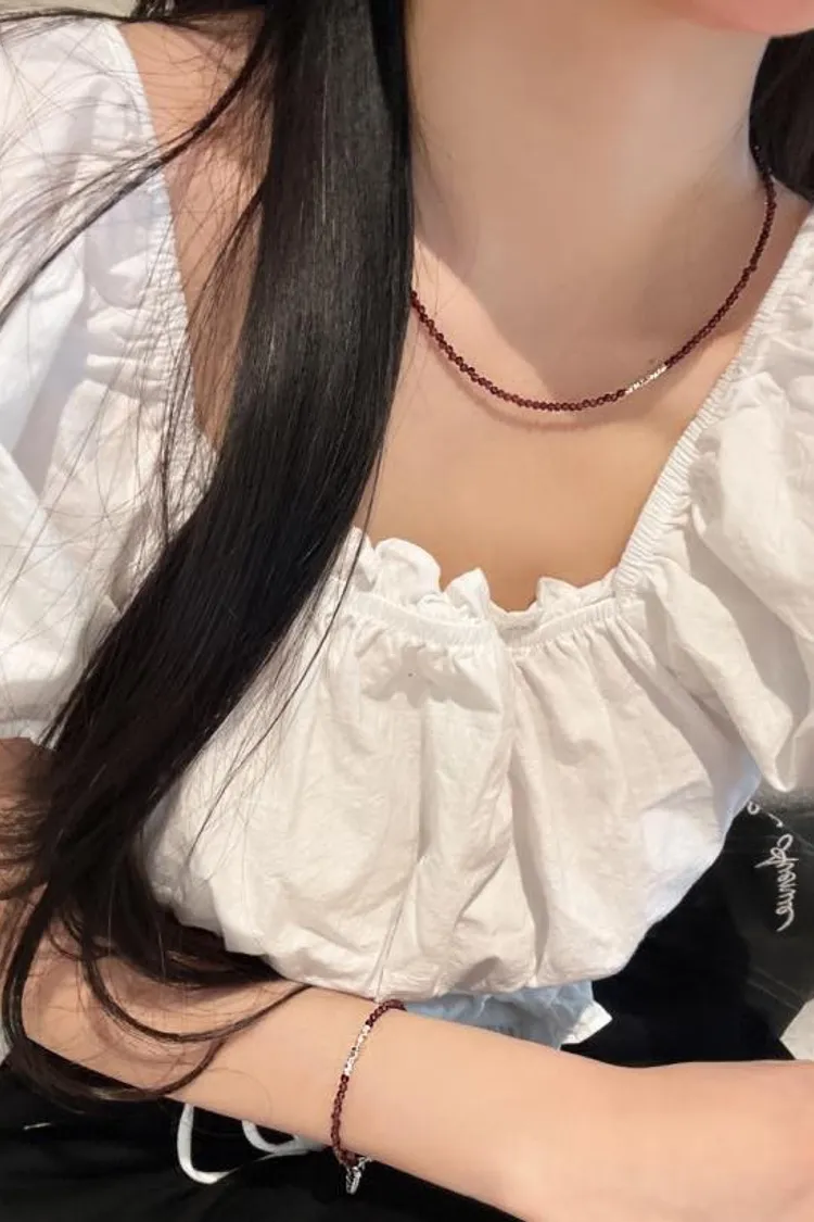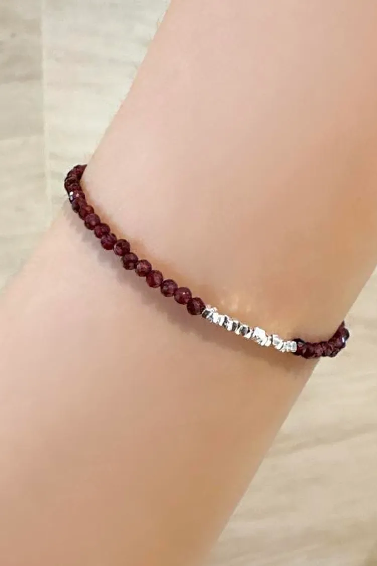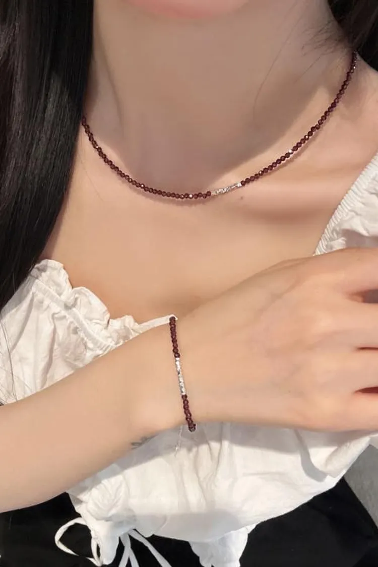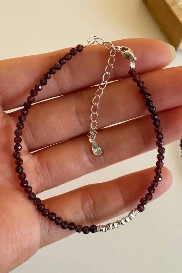 這款手鍊以細緻的切面石榴石,顏色深紅卻不厚重,戴起來很有氣質。中間搭配 925 純銀做小小提亮與點綴,低調又耐看。
