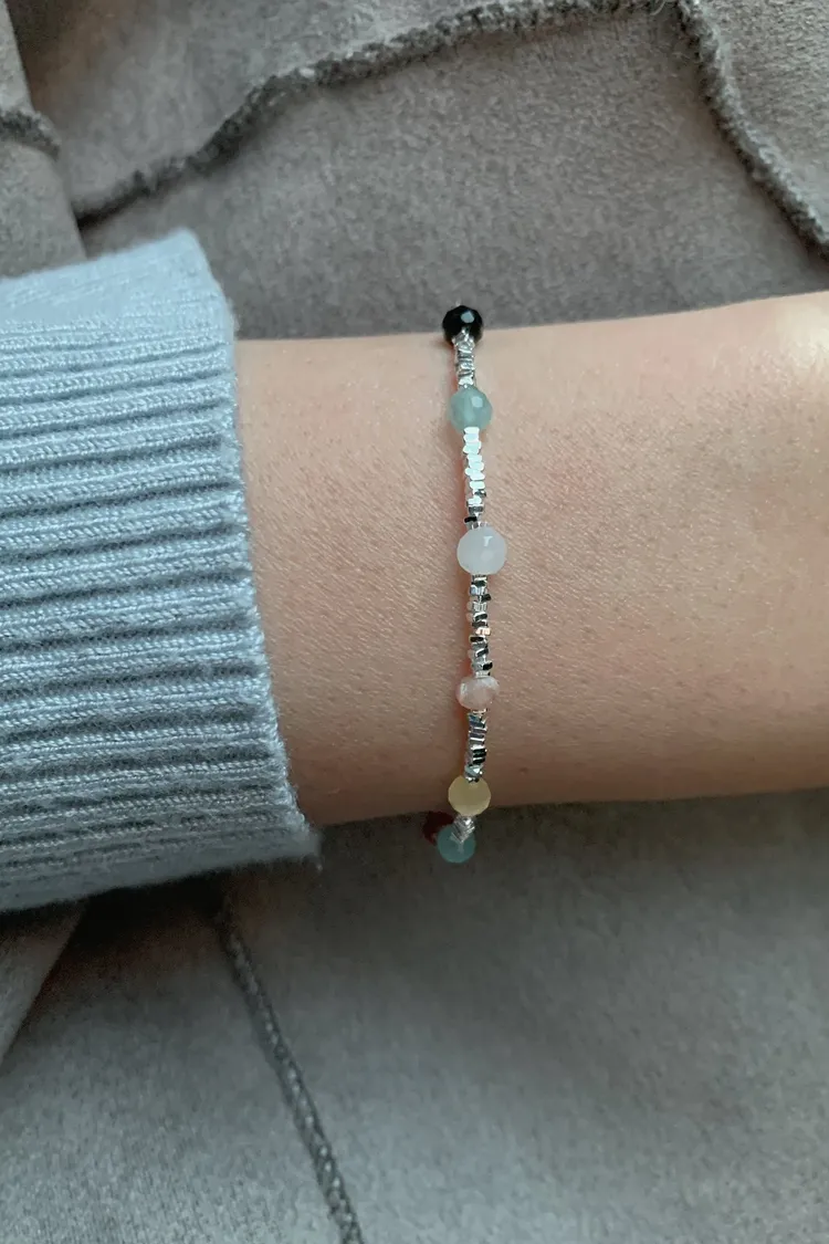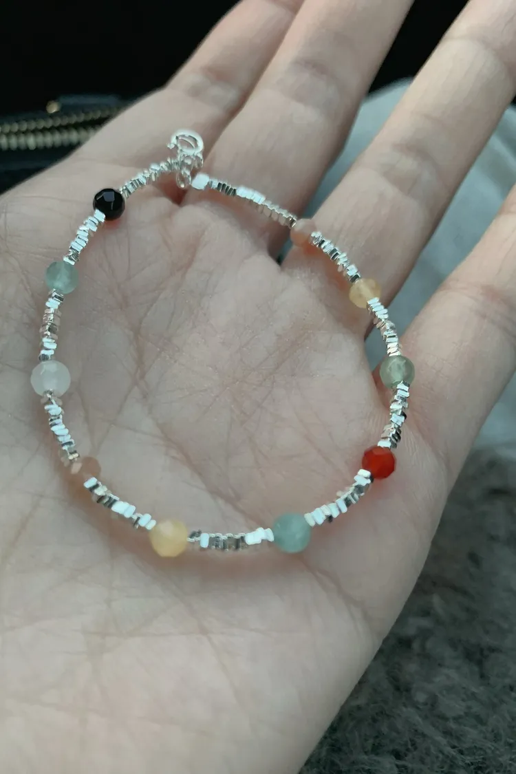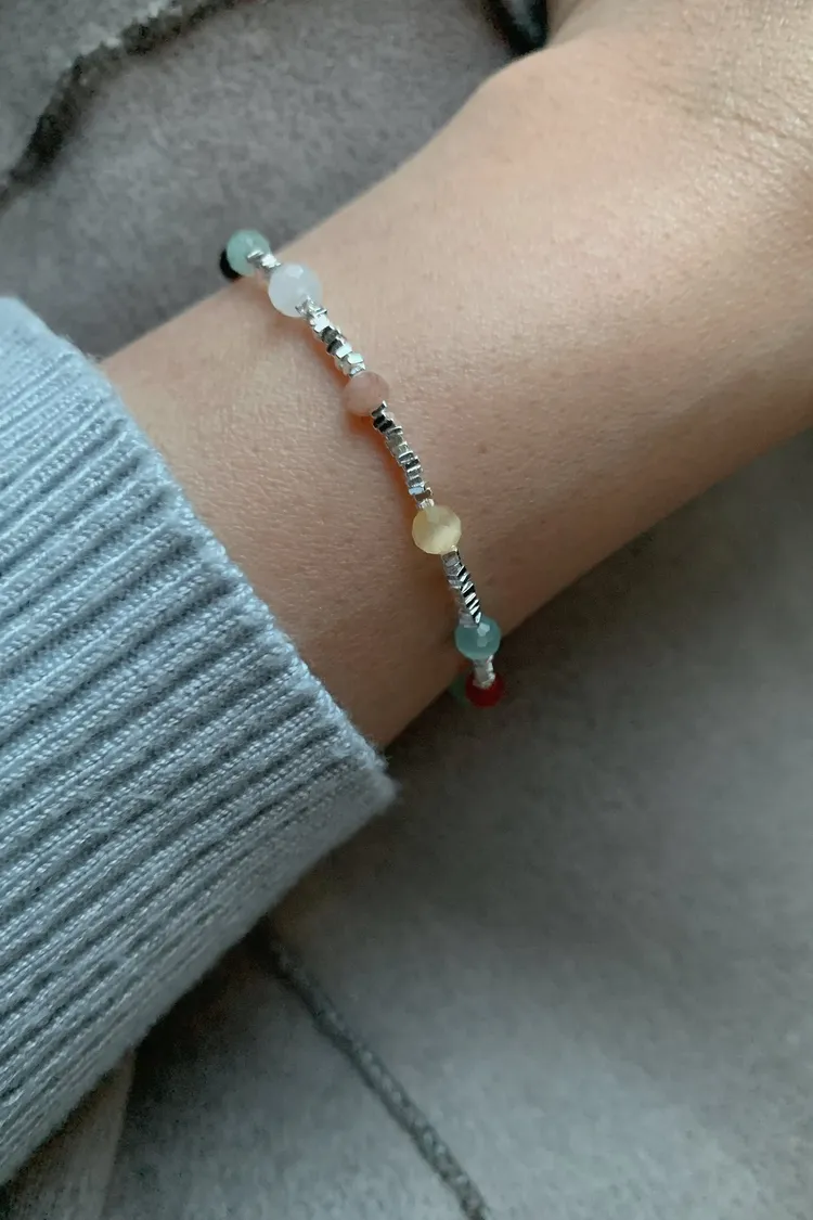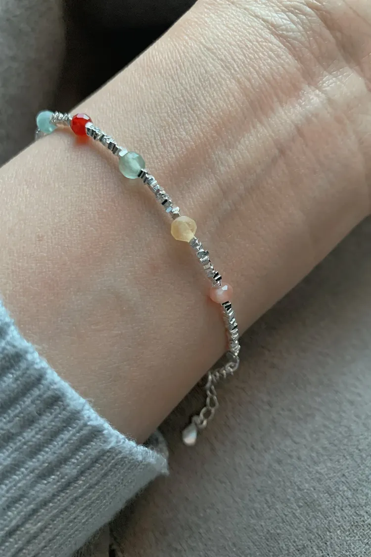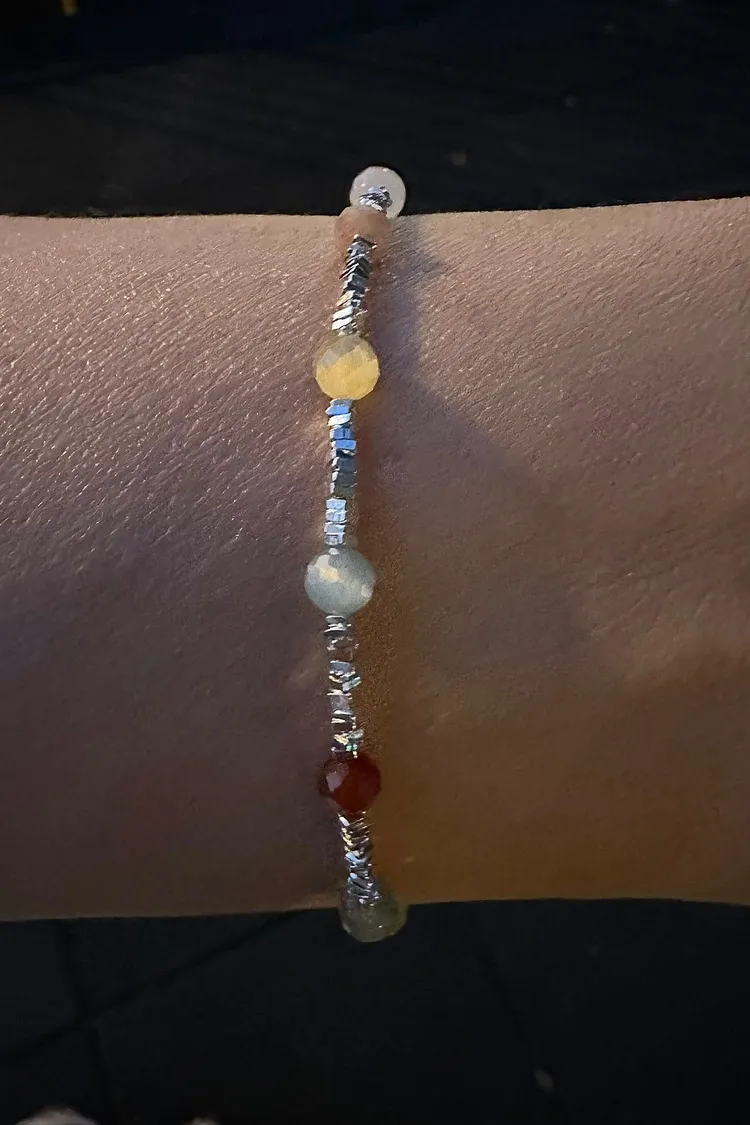 每一顆小石頭顏色都很溫柔,隨著手腕晃動會內斂的閃著隱隱微光,日常穿搭、單戴或疊戴都很好看,怎麼配都不出錯,是那種一戴就有好心情的小手鍊。
