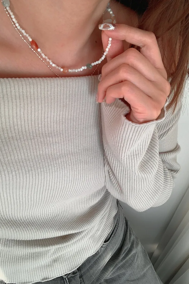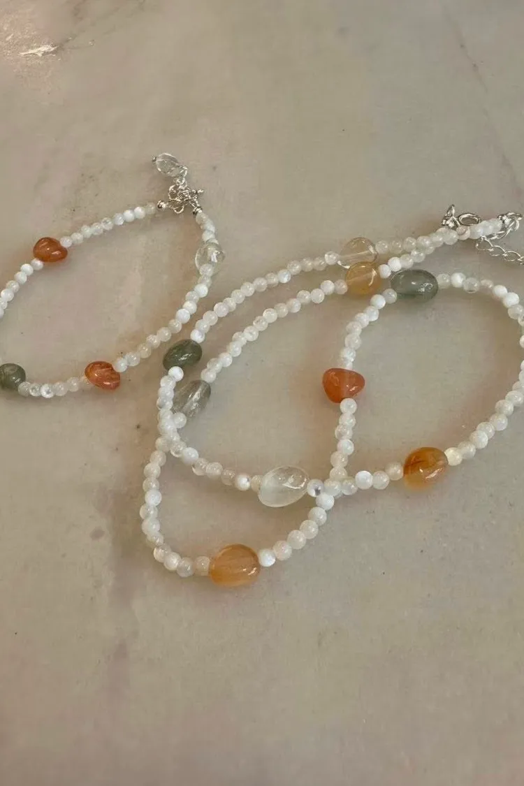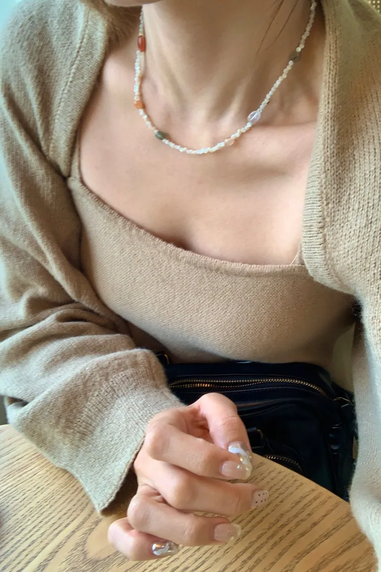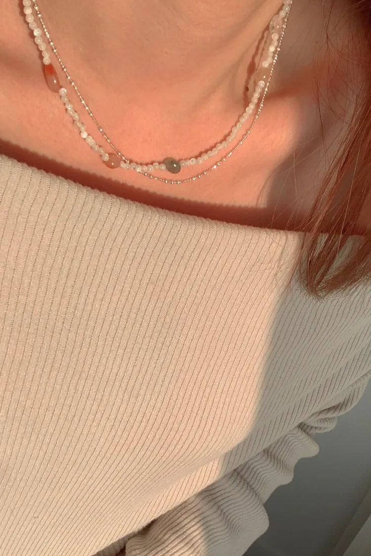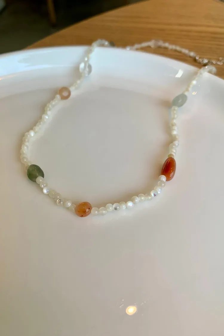 溫潤的珍珠母貝小珠,搭配紅瑪瑙、晶透天然石與透明水晶,小小色彩點綴,低調卻超有存在感。